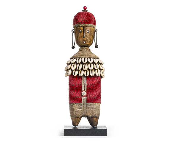 Namji dolls are adorned with glass bead necklaces, cowrie shells, metal strips and fiber; stands on a wood base.  They are carved from solid pine hardwood.  We carry an extensive variety of styles, sizes and colors in our collection and each Namji doll is an “original” work of art.  They are individually handmade making them unique and a one of a kind piece.