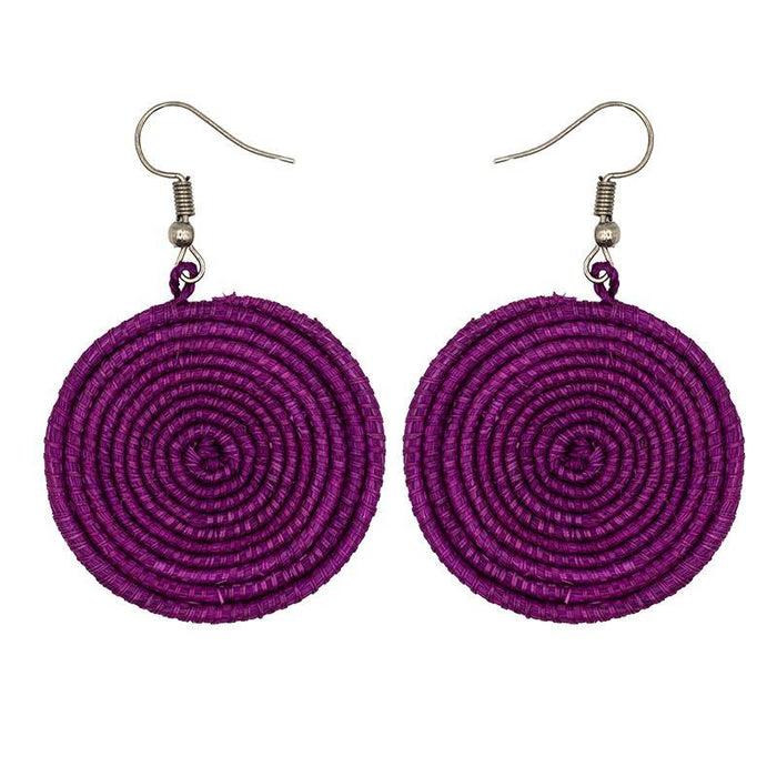 Beautiful light weight disc earrings made from embroidery thread and locally sourced sisal grass. Handmade by women artisans in Rwanda.