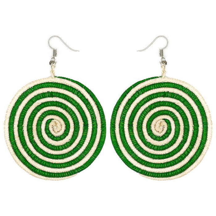 Beautiful light weight disc earrings made from embroidery thread and locally sourced sisal grass. Handmade by women artisans in Rwanda.