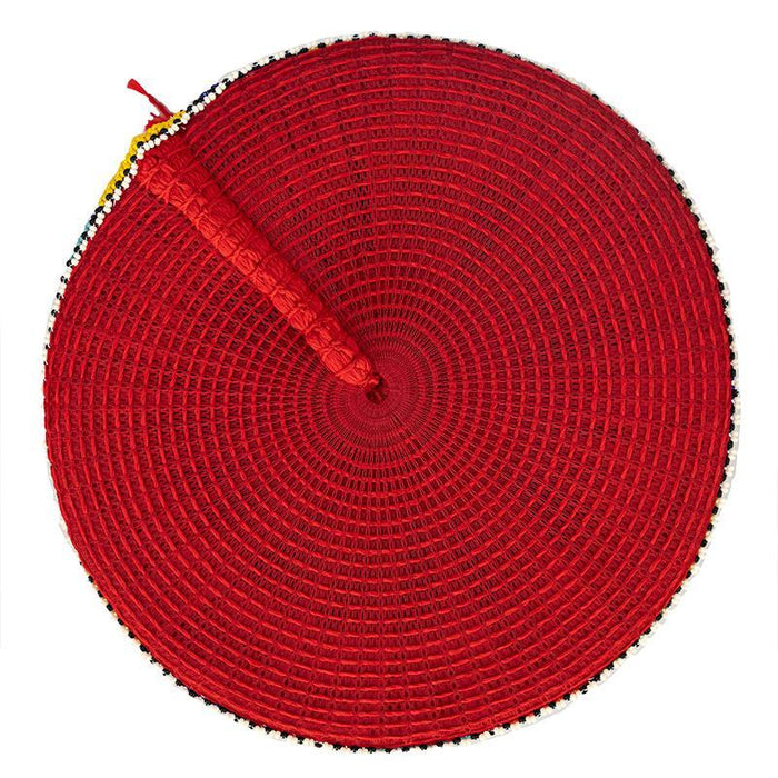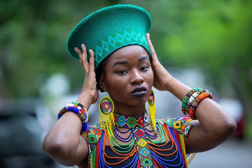 This elegant Zulu Basket Hat is the perfect accessory to upgrade any outfit. This piece is handmade by female artisans in South Africa. The hat is made out of woven grass, polyester cloth patterned with cotton, wool threads, and decorative glass beads. It can be worn on special occasions like birthdays, weddings, and formal gatherings. As with all handmade items, no two pieces are the same.