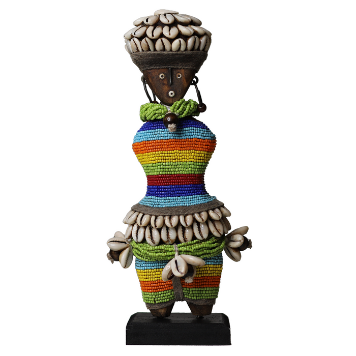 Beaded Namji dolls originated from Cameroon and are made by blacksmiths from the Namji tribe.  The Namji people inhabit West of North Cameroon.  The Namji tribe is famous for their wooden dolls carved with geometric features adorned with multi-colored bead necklaces, cowrie shells, metal strips and fiber; stand on a wood base.