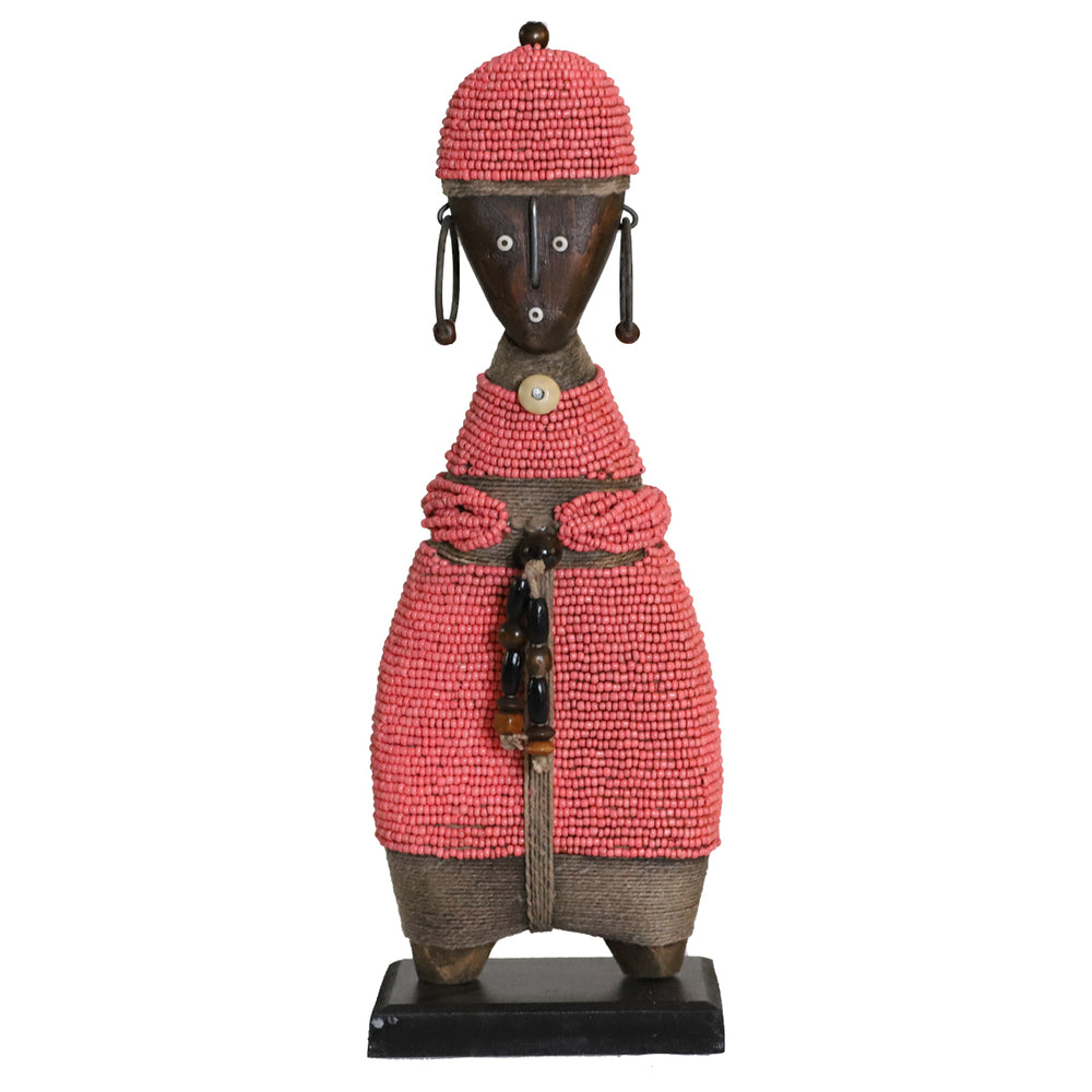 Beaded Namji dolls originated from Cameroon and are made by blacksmiths from the Namji tribe. The Namji people inhabit West of North Cameroon. The Namji tribe is famous for their wooden dolls carved with geometric features adorned with multi-colored bead necklaces, cowrie shells, metal strips and fiber; stand on a wood base.