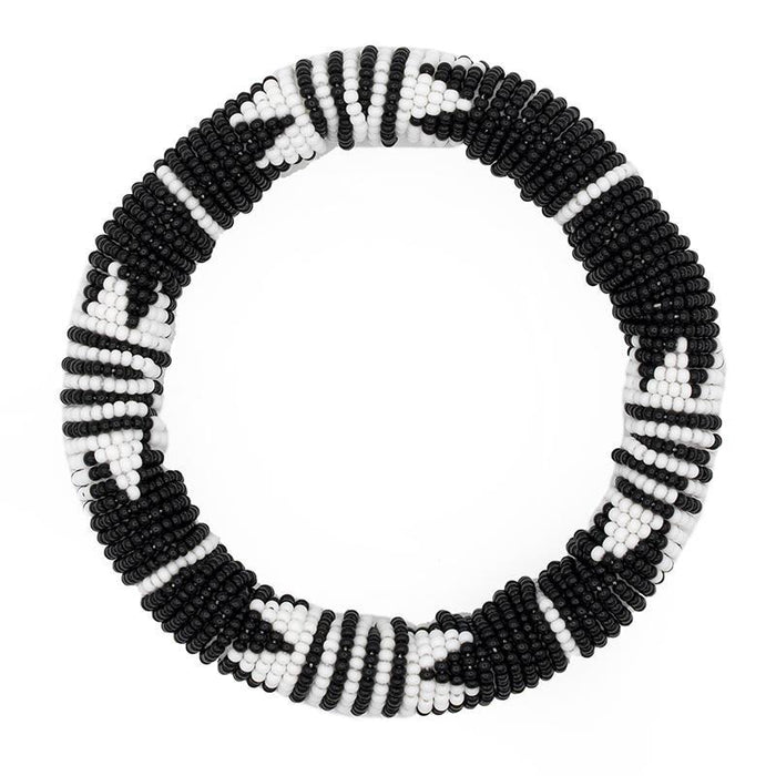 Beautiful beaded authentic bold thick bangle handmade by Zulu women in South Africa.  Bangle is handmade using glass beads, yarn and cotton.  We directly work with Zulu women to produce and market high-end beaded jewelry based on traditional beading techniques infused with modern aesthetics.