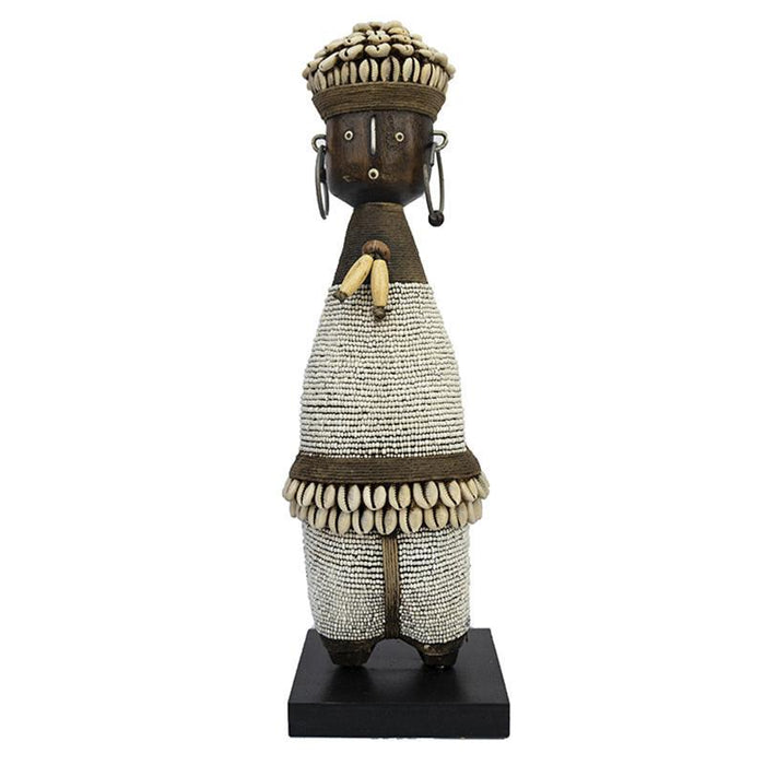 Namji dolls are adorned with glass bead necklaces, cowrie shells, metal strips and fiber; stands on a wood base.  They are carved from solid pine hardwood.  We carry an extensive variety of styles, sizes and colors in our collection and each Namji doll is an “original” work of art.  They are individually handmade making them unique and a one of a kind piece.