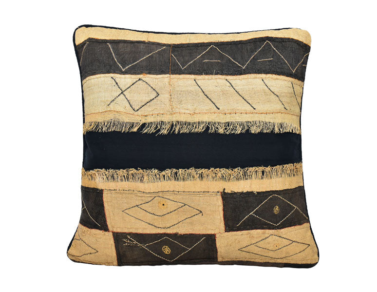 Kuba cloth is handwoven by the Kuba people of the Democratic Republic of the Congo formerly Zaire. Each Kuba cloth pillow cover is a unique work of art. The Kuba artisans hand-weave strips of raffia from the raffia palm leaves to drape around themselves at celebrations. The raffia is dyed by women with natural plant substances and woven by men. Each square takes a couple of days to complete and the designs have various meanings.