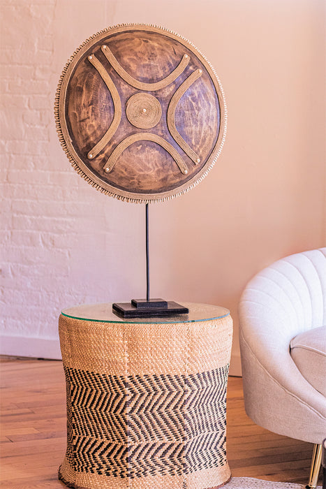 Wooden Natural Cameroon Shield on stand | Manilla Cross Design with Cowrie Edge